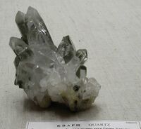 Коллекция Образования и превращения, №2191. Друза горного хрусталя. Зоны роста части кристаллов декорированы присыпками хлорита, образуя, так называемые фантомы. Размер кристаллов до 6см. Длина экспоната 12 см.