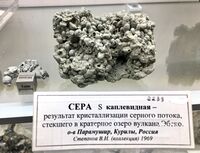 Коллекция Образования и превращения, №2233. Серо-зеленый агрегат слипшихся 4-6мм капель серы, обычно с газовой вакуолей в центре и следами вязкой деформации. Длина экспоната 8 см.