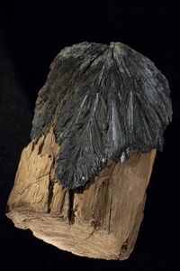 Коллекция Образования и превращения, №2243. Сфероидолитовая конкреция выросшая между реликтовых годовых колец в лигнитизированном дереве. Длина экспоната 11 см.Размер минерала 8.5 см.