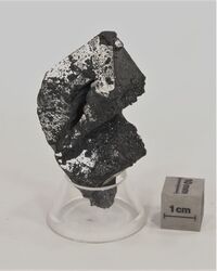 Коллекция Образования и превращения, №2260. Псевдоморфоза гематита по реберному скелетному кристаллу магнетита вытянутому вдоль оси 4-го порядка и завершенному сростком полногранных октаэдрических кристаллов. Размер образца 7х3 см. Размер октаэдрических кристаллов до 2.5 см. Длина экспоната 7 см.Размер минерала 7 см.