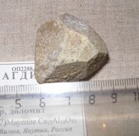Коллекция Образования и превращения, №2288. Певдоморфоза гиббшита по майениту (?). Кристалл {112} - тригонтритетраэдр. Длина экспоната 4 см.Размер минерала 4 см.