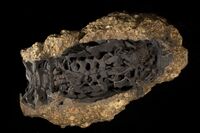 Коллекция Образования и превращения, №2349. Тонкозернистый агрегат черного цвета псевдоморфно замещающий внутренности морского рака, заключенного в "табачную" руду. Длина экспоната 13 см.