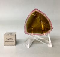 Коллекция Образования и превращения, №2409. Полированная пластина толщиной около 3мм - поперечный срез зонального кристалла эльбаита с чередующимися желтой в центре и тонкими бесцветной и малиновой зонами у периферии. С четко выраженной секториальностью Длина экспоната 3 см.