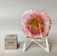 Коллекция Образования и превращения, №2410. Полированная пластина толщиной около 3мм - поперечный срез зонального кристалла эльбаита с чередующимися желтой в ядре, розовой в центре и бледно-розовой до бесцветной у периферии зонами. С неясно выраженной секториальностью Длина экспоната 4 см.
