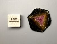 Коллекция Образования и превращения, №2416. Полированная пластина толщиной около 2мм - поперечный срез секториально-зонального кристалла эльбаита с розовым "мерседесовским пропеллером в центре, зеленой зоной и секторами в гкоторых густота окраски увеличивается к периферии. Длина экспоната 3 см.
