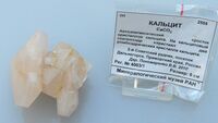 Коллекция Образования и превращения, №2555. Автоэпитаксический сросток кристаллов кальцита. Hа кальцитовый скаленоэдр нарастают два ромбоэдрических кристалла кальцита. Длина экспоната 6 см.