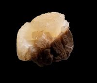 Коллекция Образования и превращения, №3011. Сферокристалл стеллерита диаметром около 4 см с желтой верхней полусферой и менее развитой нижней частью (коричневой за счет механических включений). Размер образца 4 х 4 х 4 см. Длина экспоната 4 см.Размер минерала 4 см.