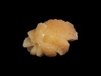 Коллекция Образования и превращения, №3012. Неравномерно развитый сферокристалл стеллерита размером около 7 х 4.5 х 4.5 см. Половина сферокристалла окрашена в желтоватый цвет, а другая в коричневый за счет механических включений. Размер образца 7х4х4 см. Длина экспоната 7 см.