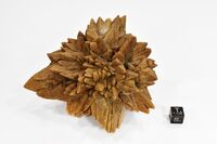 Коллекция Образования и превращения, №3202. Псевдоморфоза кальцита по икаиту. Радиальный сросток заместивших икаит оранжево-коричневатых копьевидных кристаллов кальцита размером от 1 до 3 см. Длина экспоната 12 см.