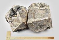 Коллекция Образования и превращения, №3262. Сросток разделённых по индукционной поверхности двух гигантских (38 х 30 х 23 и 30 х 27 х 23 см) ромбододекаэдров содалита, почти полностью замещённых белым натролитом. В кристаллах каверны, заполненные кристаллами натролита с зелёным тонкоигольчатым эгирином и кристаллами лоренценита до 1-1.5 см. Вдоль плоскости граней уплощённо-вытянутые кристаллы натролита длиной до 9 см и редкие кристаллы циркона до 0.7 см. Длина экспоната 55 см.