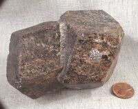 Коллекция Кристаллы, №3643. Сросток двух ромбододекаэдров альмандина размерами 9 и 8см. Длина экспоната 11 см.Размер минерала 9 см.
