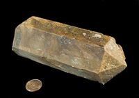 Коллекция Кристаллы, №3729. Зеленый с коричневыми пятнами призматический двухголовый кристалл размером 16х6,5х5,5см. Огранен призмой {110} и дипирамидой {111}. Длина экспоната 16 см.Размер минерала 16 см.