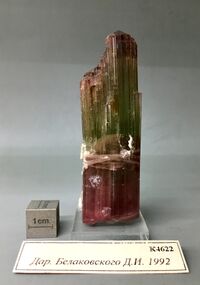 Коллекция Кристаллы, №4622. Дитригональнопризматический полихромный многоглавый деформированный кристалл. 8х2.5 см. Длина экспоната 8 см.