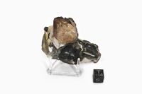 Коллекция Кристаллы, №4635. Короткостолбчатый кристаллл стиллвеллита-(Ce) размером 3 см, образованный формами: {100}+{101}+ кривогранный пинакоид {001} и его же мелкие кристаллы с эгирином, микроклином, полиминеральной псевдоморфозой по неизвестному минералу и частично замещенном цектцеритом и согдианитом. 8х5.5 см. Длина экспоната 8 см.