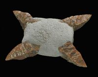 Коллекция Кристаллы, №4726. Псевдоморфоза кальцита по икаиту. Косой крестообразный сросток коричневых копьевидных до 4,5см кристаллов обросший в центральной части серой глинисто-карбонатной конкрецией. Длина экспоната 12 см.