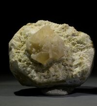 Коллекция Кристаллы, №5132. Бледно-желтоватый блочный дипирамидальный кристалл повеллита размером около 2,5 см на цеолитовом агрегате на кальците. Длина экспоната 5 см.Размер минерала 2.5 см.