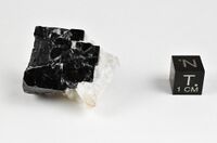 Коллекция Кристаллы, №5189. Кубооктаэдрический кристалл Nb-содержащего перовскита размером 21 мм по ребру в кальцит-доломитовом крупнозернистом карбонатите. Длина экспоната 3.5 см.Размер минерала 3 см.