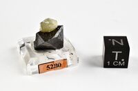 Коллекция Кристаллы, №5230. Сросток октаэдрического, модифицированного гранями ромбододекаэдра кристалла магнетита размером 1,5 см и серовато-зеленоватого почти бесцветного кристалла форстерита размером около 1 см, ограненного комбинацией пинакоида, призм и дипирамиды. 2 х 1 х 1 см. Длина экспоната 2 см.Размер минерала 1.5 см.