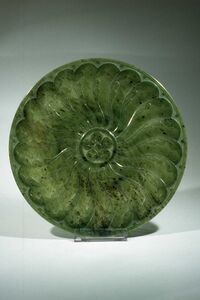 Коллекция Поделочные и драгоценные камни, №1745. Тарелка. Петергофская гранильная фабрика - надпись на коробке. Длина экспоната 20 см.