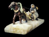 Коллекция Поделочные и драгоценные камни, №2570. Возница, везущий лед на лошади запряженной, в сани. Вожжи и веревки - серебро 875 пробы. Художник Г.К. Савицкий Объемная мозаика по серебряной модели К.Г. Армфельда, работавшего с 1895 по 1916 г. в фирме Фаберже. Разноцветные яшмы, кахолонг,нефрит, змеевик, лазурит, кварц. 35х18х14 см. серебро 875 вес - 1900 гр. (М.Б.Чистякова. Журнал "Новые данные о минералах", 2004, вып. 39.с. 126). Длина экспоната 35 см.