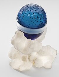 Коллекция Поделочные и драгоценные камни, №2723. Синий стеклянный резной полый шар на подставке из хрусталя. Работа Фаберже 1910-1914 год. шар d=7.7 подставка h=11 Уточнение: Императорское пасхальное яйцо "Созвездие Цесаревича" Санкт-Петербург, фирма К.Фаберже, 1917 год. Горный хрусталь, стекло; резьба по камню и стеклу. Для придания изделию яйцевидной формы в Гос. научно-исследовательском институе реставрации визделие вставлен пластиковый поясок. 17.5х15,5х11 см. Вес (с пластиковым пояском) 1903 г. (Чистякова, 2004, с.138-140). Длина экспоната 17.5 см.