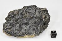 Коллекция Коллекция В.И.Степанова, №4018. Пучки серых 1,5-2 см плоских призм в плоскости сланцеватости филлитового сланца с мелкими призмами ставролита и тройниковой звездой, альмандин - зерна до 3 мм, частично замещенные крупночешуйчатым биотитом. Длина экспоната 9 см.