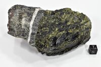 Коллекция Коллекция В.И.Степанова, №4647. Параллельно-волокнистая серовато-зеленая 4.5-0.5см оторочка замещения диопсида вокруг реликтового эпидотово-зеленого монокристаллического ядра диопсида I генерации на контакте с агрегатом кальцита, Fe-флогопита и волокнистого рихтерита, темный зеленовато-серый форстерит. Длина экспоната 10 см.