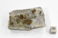 [Зеленовато-желтые до буро-красноватых прозрачные сростки кристаллов до 1см тетраэдрического габитуса и наросшие на них таблитчатые двойники по (111) кристаллов до 2,5см. Корочка мелких кристаллов кварца.] А. Hикифоров Длина экспоната 7 см.Размер минерала 2.5 см.