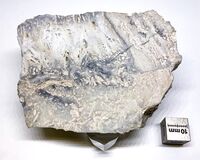 Коллекция Коллекция В.И.Степанова, №5250. До 15х2мм белые землистые скопления литий-тосудита в пустотах мелких ячей халцедоновидного кварца, заместившего агрегат пластинчатого кальцита в полосчатой жиле. Длина экспоната 8 см.