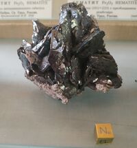 Коллекция Коллекция В.И.Степанова, №5729. Друза блестящих расщепленных клиновидно-таблитчатых кристаллов гематита размером от 2 до 6см., частично в двойниковом по (1011) положении на облекающей бывшее гнездо хлоритовой корочке. Длина экспоната 7 см.Размер минерала 6 см.