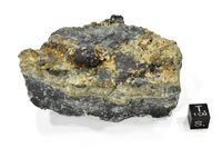 Коллекция Коллекция В.И.Степанова, №5831. Блестящий 15мм ступенчатый кубооктаэдр магнетита из 3-4мм одиночных кубов на корочке буровато-желтых 1.5мм блестящих кристаллов андрадита на хлоритовой породе по серпентиниту. Длина экспоната 9 см.Размер минерала 1.5 см.