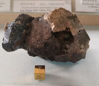 Коллекция Коллекция В.И.Степанова, №5864. Крупные таблитчатые кристаллы ильменита с кристаллами микроклина и циркона в пустоте пегматита, игольчатый эгирин, альбит, натролит, х? Длина экспоната 9 см.Размер минерала 4 см.