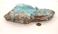 | + | Голубые иголочки на буром камне (<b>лимоните</b>) — это минерал <b>аурихальцит</b>, карбонат цинка и меди. Он образуется там, где в приповерхностных условиях окисляются первичные полиметаллические руды.<br> | ||