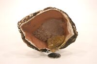 Данный образец добыт на осадочных железорудных месторождениях близ г.Керчь на территории восточного Крыма. Он представляет собой раковину двустворчатого моллюска, которая замещена различными карбонатами марганца, от марганцовистого кальцита до родохрозита. Последний получил название от греческого «родон» (роза) благодаря своему цвету. Родохрозит образует сферолитовую корочку внутри раковины, где также видны желтоватые кристаллы барита. С выпуклой стороны образца можно увидеть множество более мелких раковин моллюсков, также частично заместившихся карбонатами марганца. Формирование железистых и марганцевых осадков происходило 3-4 млн лет назад в море. Внутри раковины и с ее обратной стороны видны следы накопления железистых осадков. Скопление материала в углублении створки указывает на то, что раковина лежала на дне в определенном положении.