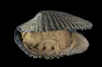 Коллекция Систематическая коллекция, №86256. Псевдоморфоза крупнокристаллического агрегата на приоткрытой раковине моллюска. 6х4.5х3 см.